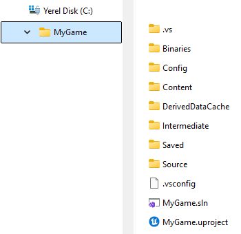 1. Yapılan işlemler neticesinde, aşağıda gösterilen dizin yapısında MyGame adlı bir proje oluşturulur.
