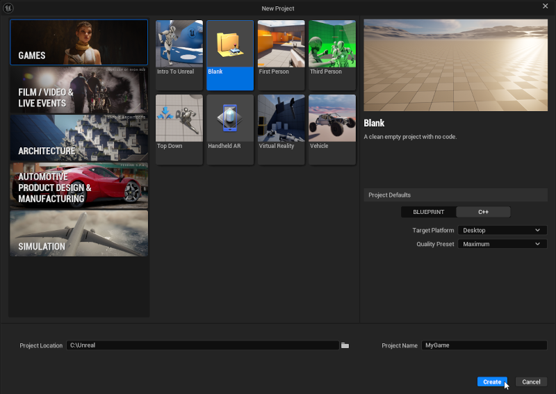 Bu bölümde, Unreal Engine 5.7.1'de Blank şablon ile C++ tabanlı bir proje oluşturarak çalışma mantığını incelemeye çalışacağız.