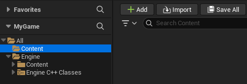 4. Unreal Editor Content Drawer'da aşağıdakine benzer bir pencere karşımıza gelir. Content dizini altında herhangi bir dizin veya dosya yer almaz.