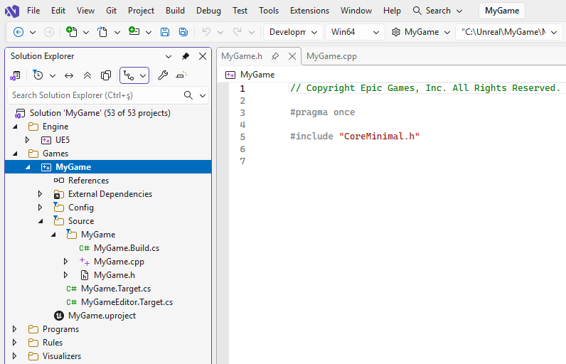 2. Visual Studio 2026 penceresinde, "MyGame\Source\MyGame" dizininde yer alan aşağıdaki dosyalar gösterilir: