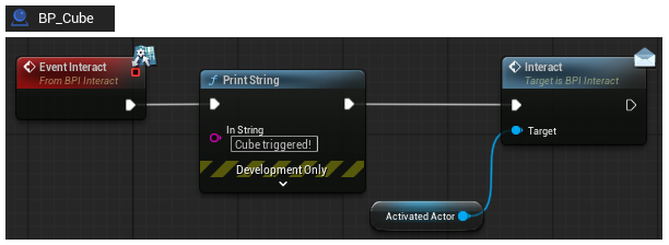 - "BP_Cube" içinde oluşturulan "Interact" arayüzü ile oluşturulan "Event Interact" kutusundan oluşturulan "Print String" kutusu ile "Cube triggered!" ifadesi ekrana yazılır.