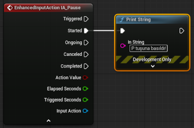 5. Bu kutunun Started portundan Print String ile yazdığımız herhangi bir yazı, oyun başlattıktan sonra P tuşuna bastığımızda ekrana yazılır.