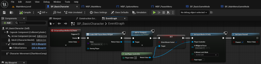 - "Add To Viewport" kutusunun çıkışını "SET (Show Mouse Cursor)" kutusuna, "SET (Show Mouse Cursor)" kutusunun çıkışını "Set Input Mode UI Only" kutusuna ve "Set Input Mode UI Only" kutusunun çıkışını "Set Game Paused" kutusuna bağlayalım.