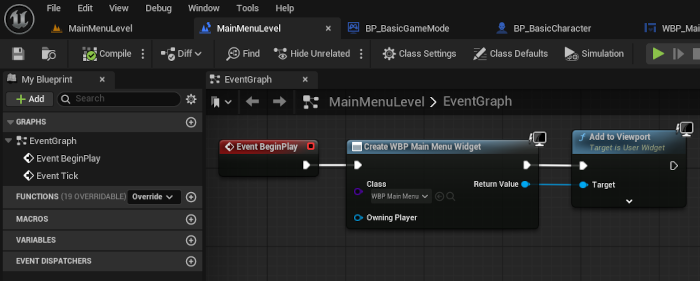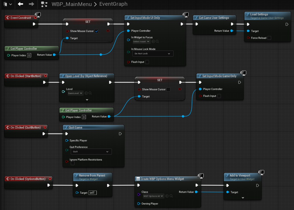 Yapılan işlemler sonucunda, "WBP_MainMenu" EventGraph penceresi aşağıdaki şekilde oluşacaktır: