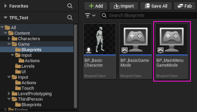 2. Ana menü Level'ı için bir GameMode oluşturmak için, "Game\Blueprints" dizini altında iken, sağ tıklayınca açılan menüde Blueprint Class seçeneğini seçince gelen pencerede "Game Mode Base" butonuna tıklayarak, yeni bir sınıf oluşturup adını "BP_MainMenuGameMode" olarak değiştirelim.