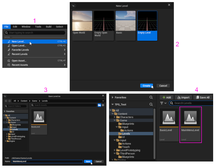 1. "File - New Level" menüsünden gelen pencerede "Empty Level" seçeneğini seçip "Create" butonuna tıklayarak yeni bir Level oluşturduktan sonra "Save" butonuna tıklayalım ve "Game\Levels" dizini altına "MainMenuLevel" olarak kaydedelim.