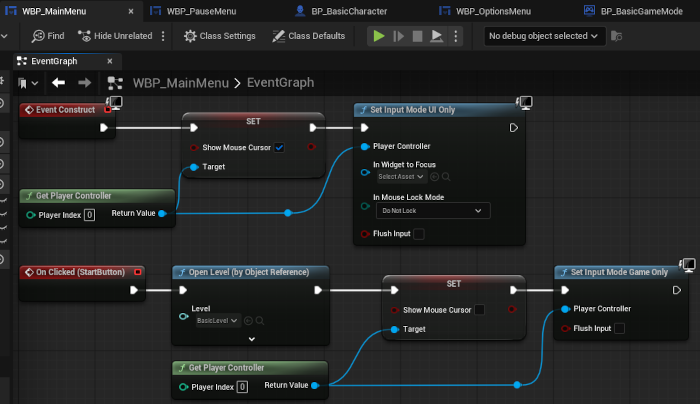 Menü ekrana geldiğinde fareyi göstermek ve oyuna geçiş yapıldığında gizlemek için "WBP_MainMenu" EventGraph penceresinde, aşağıdaki işlemleri sırasıyla gerçekleştirelim:
