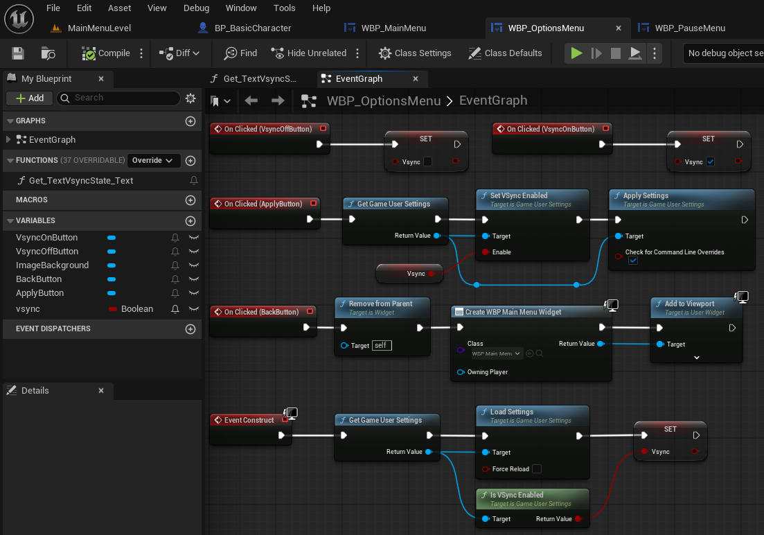 - "VsyncOffButton" seçili iken, "Details" sekmesinde en altta yer alan Events bölümünde "On Clicked" satırının sağındaki + butonuna tıklayarak, WBP_OptionsMenu EventGraph penceresinde sahneye "On Clicked (VsyncOffButton)" kutusu ekleyelim.
