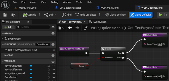 - "Get Game User Settings" kutusunun "Return Value" çıkışından "Is VSync Enabled" kutusu açalım.