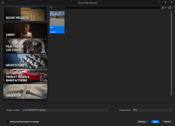 Unreal Engine ile daha önceden oluşturulmuş projeleri, Epic Games Launcher penceresinin "Library" sekmesindeki Projelerim bölümünden, Unreal Engine proje tarayıcısının RECENT PROJECTS bölümünden veya doğrudan disk üzerinde tıklayarak açabiliriz.