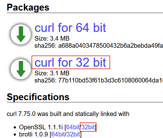 1. Bu bağlantıda yer alan ve aşağıda gösterilen curl-7.75.0-win32-mingw.zip ve openssl-1.1.1i-win32-mingw.zip dosyalarını bilgisayarımıza indirelim: