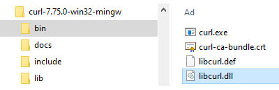 2. Bu dosyaları bilgisayarımızda açtıktan sonra, curl-7.75.0-win32-mingw dizini altındaki bin dizini içinde yer alan libcurl.dll dosyasını projemizin .exe dosyasının bulunduğu dizine kopyalayalım: