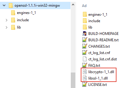 3. openssl-1.1.1i-win32-mingw dizini içinde yer alan libcrypto-1_1.dll ve libssl-1_1.dll dosyalarını projemizin .exe dosyasının bulunduğu dizine kopyalayalım: