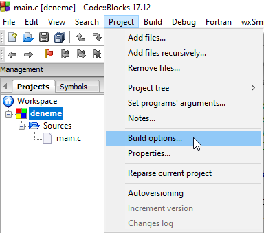 4. Projemizin adının deneme olduğunu kabul ederek, CodeBlocks IDE menüsünden Project - Build options seçeneğine tıklayalım: