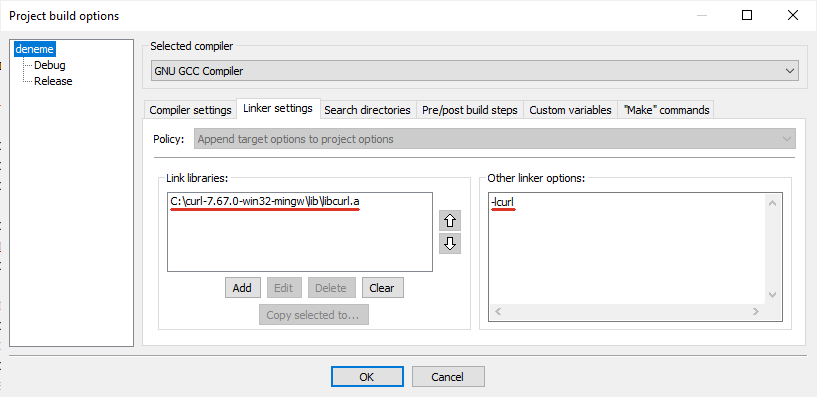5. Karşımıza gelen "Project buid options" penceresinde Linker settings sekmesini seçtikten sonra, curl-7.75.0-win32-mingw dizini altındaki lib dizini içinde yer alan libcurl.a dosyasını "Link libraries" bölümüne ve -lcurl ifadesini "Other linker options" bölümüne ekleyelim: