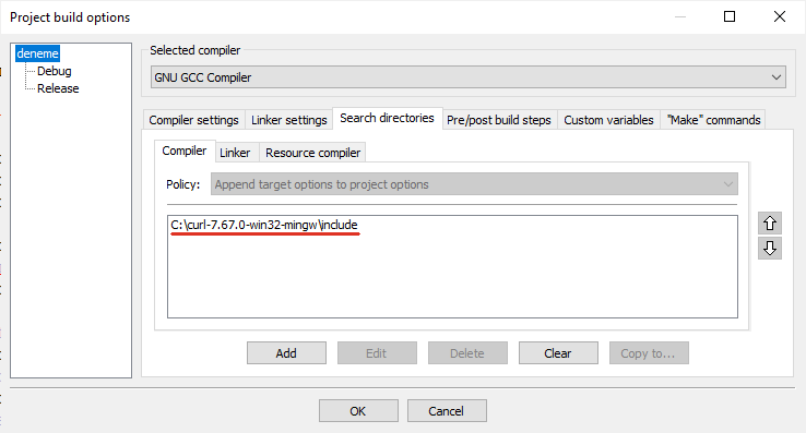 6. Search directories sekmesini seçtikten sonra, "Compiler" sekmesine curl-7.75.0-win32-mingw dizini altındaki include dizinini ekleyelim:
