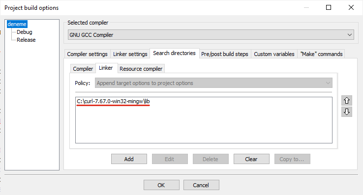 7. Yine Search directories sekmesinde, "Linker" sekmesini seçip, curl-7.75.0-win32-mingw dizini altındaki lib dizinini ekleyelim: