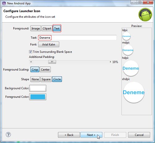 3. Bu bölümde programınız için kullanacağınız ikon ayarlamaları yapılır. Karşınıza gelen pencerede Text butonuna tıklayın ve Text bölümünün karşısına "Deneme" ifadesini yazın ve Next butonuna basın: