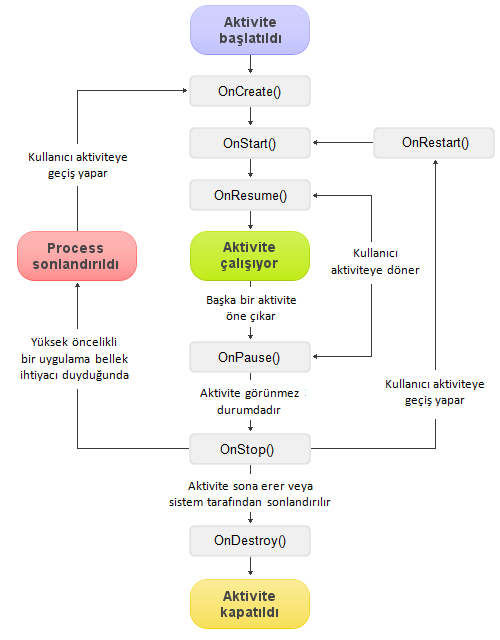 Aşağıdaki şekil aktivitelerin uyguladıkları döngüleri, durumlar arası geçişlerde izledikleri yolları göstermektedir: