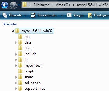 2. İndirdiğimiz .zip uzantılı dosyayı (32 bit sürümünü indirdiğinizi düşünerek - mysql-5.6.11-win32.zip) bilgisayarımızda uygun olan bir sürücüye açalım. Dosyayı C: sürücüsünde açtığımızda elde ettiğimiz dizin yapısı aşağıda gösterilmektedir: