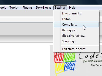 3. Artık, MySQL Gömülü Sunucu kütüphanesini CodeBlocks IDE içine entegre etmeye başlayabiliriz. Code::Blocks IDE'yi çalıştırdığımızda karşımıza gelen ekranda aşağıdaki resimde gösterilen Settings-Compiler... menü seçeneğine tıklayalım: