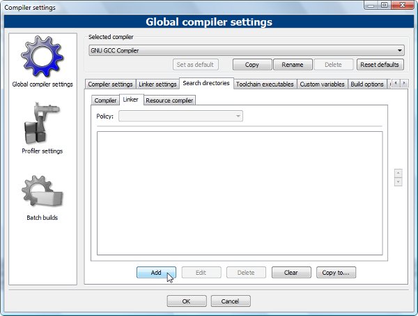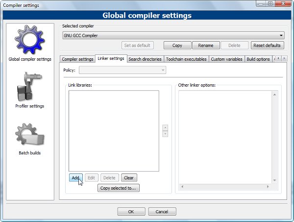 4. Karşımıza gelen pencereden "Linker settings" bölümünü seçelim ve "Add" butonuna tıklayalım: