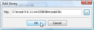 butonuna tıklayarak bilgisayarımızdaki mysql-5.6.11-win32 dizini altında yer alan lib dizinindeki libmysqld.lib dosyasını ekleyelim ve "OK" butonuna tıklayalım: