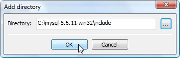 butonuna tıklayarak, bilgisayarımızdaki mysql-5.6.11-win32 dizini altında yer alan include dizinini ekleyelim ve "OK" butonuna tıklayalım: