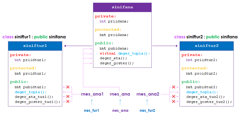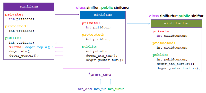 Sanal fonksiyon tanımlaması sadece sinifana sınıfı içinde yapıldığından, siniftur ve sinifturtur sınıflarından oluşturulan nesneler sanal fonksiyon çağrısı yaptıklarında sinifana sınıfı içindeki sanal fonksiyon devreye girer.