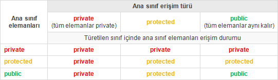 Kalıtım türüne göre ana sınıf elemanlarının türetilen sınıf içindeki durumunu gösteren tablo aşağıdadır: