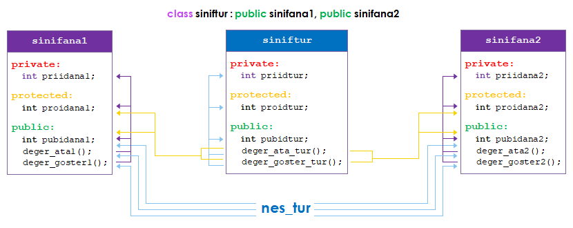 Sonra, aynı nesne ile, deger_ata_tur1() ve deger_ata_tur2() fonksiyonları ile siniftur1 ve siniftur2 sınıflarının protected ve public değişkenlerine erişim sağlar ve bu değişken değerlerini kullanarak kendi değişkenlerine değer atar. Aynı nesne ile deger_goster_tur1() ve deger_goster_tur2() fonksiyonları ile değişken değerlerini ekrana yazar.
