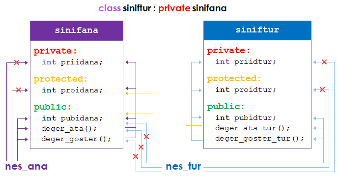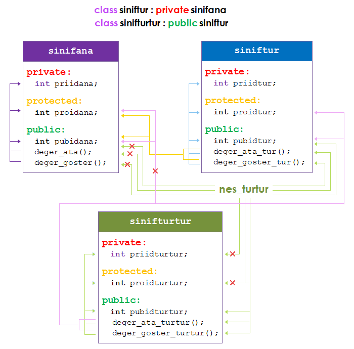 Programda oluşturulan sınıfların içindeki elemanlar ile bu sınıflardan oluşturulan nesnelerin erişim durumlarını gösteren şema aşağıdadır: