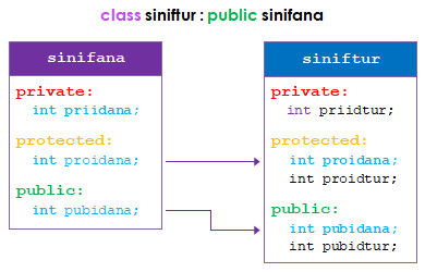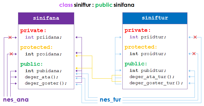 Program çalışmaya başladığında, türetilmiş sınıf olan siniftur türünden nes_tur adlı bir nesne oluşturur. Bu nesne yoluyla ana sınıf içindeki fonksiyonlara erişim sağlayarak, önce ana sınıf içindeki değişkenlere birer değer atar sonra değişken değerlerini ekrana yazar. Aynı nesne ile doğrudan ana sınıf içinde public pubidana değişkenine bir değer atar ve ana sınıf içindeki deger_goster() fonksiyonu ile değişken değerlerini tekrar ekrana yazar.
