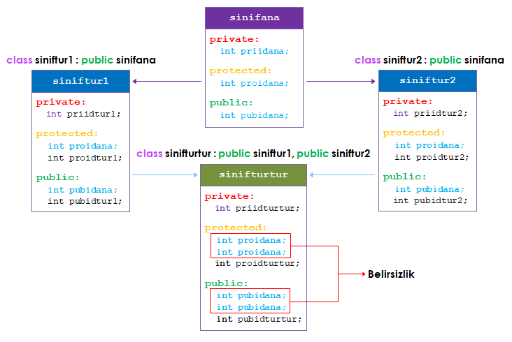 Aşağıdaki şekilde, sinifana sınıfından siniftur1 ve siniftur2 adlı iki adet sınıf public olarak türetilmiş, siniftur1 ve siniftur2 sınıfları ana sınıf olarak kullanılarak sinifturtur adlı sınıf yine public olarak türetilmiştir. Bu durumda, ana sınıf içindeki proidana protected değişkeni ile pubidana public değişkeni siniftur1 ve siniftur2 sınıflarına aynı erişim türü ile aktarılmıştır. Ancak, sinifturtur sınıfından bir nesne oluşturulduğunda, proidana ve pubidana değişkenlerinin, birisi siniftur1 üzerinden diğeri de siniftur2 üzerinden olmak üzere, aktarılan ikişer kopyası nesne üzerinde oluşacaktır. Bu durum, bir program içinde meydana geldiğinde, bir belirsizlik oluşturarak derleme hatası verecektir.