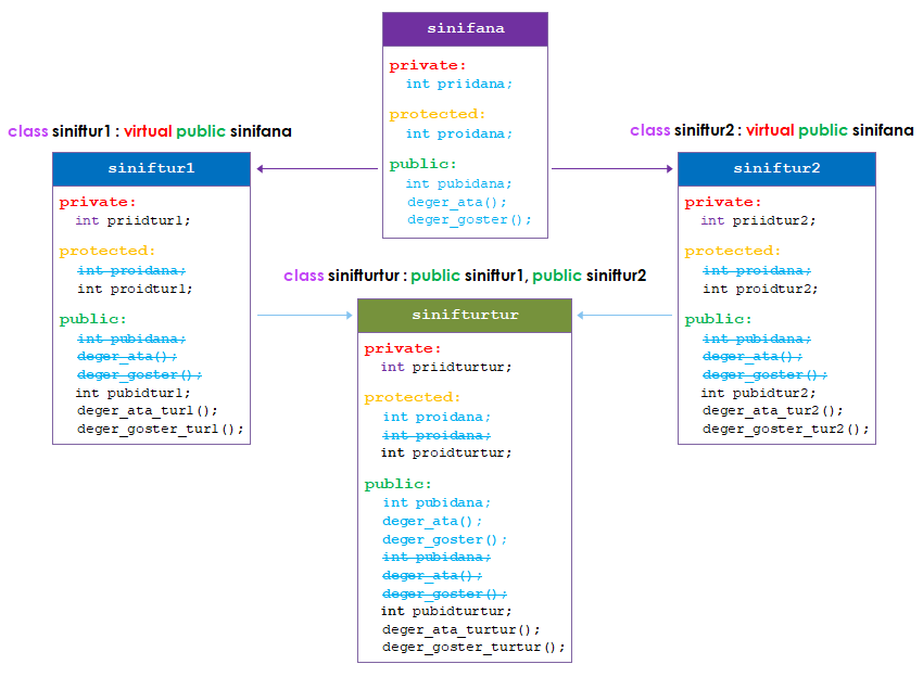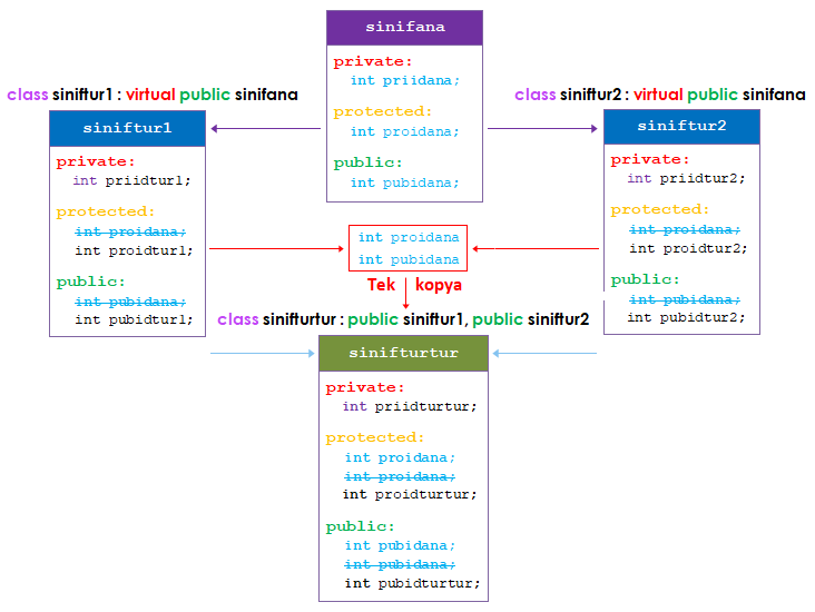 Siniftur1 ve siniftur2 adlı sınıfları türetirken virtual anahtar kelimesini kullandığından, sinifturtur sınıfından bir nesne oluşturulduğunda, nes_turtur değişkeni üzerinde ana sınıf içindeki elemanların sadece tek bir kopyası oluşur.