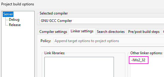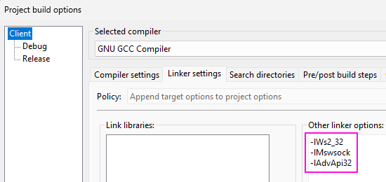 • İstemciyi çalıştırmak için, istemci kaynak kodunu derleyin ve çalıştırın. Kodu CodeBlocks IDE ortamında derlemek için, "Project - Build Options..." menüsünden açılan "Project Buid Options" penceresinin "Linker settings" sekmesinin "Other linker options" bölümüne -lWs2_32, -lMswsock ve -lAdvApi32 değerlerini ekleyerek ws2_32.lib, Mswsock.lib ve AdvApi32.lib kütüphanelerini yüklememiz gerekir.