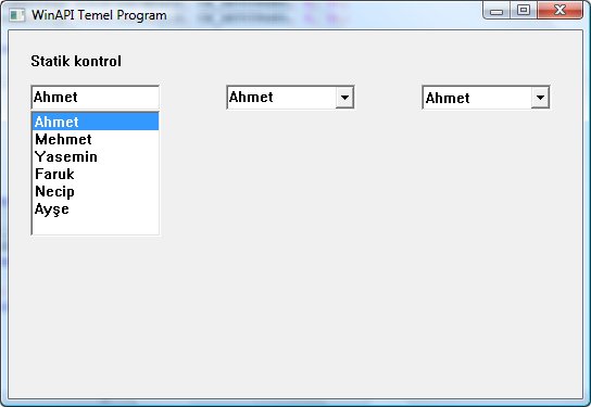 CBS_DROPDOWNLIST : Liste içinde yer alan elemanları düğmeye tıklandığında ekranda gösterir. Seçili olan elemanı ise bir Statik kontrol içinde gösterir.