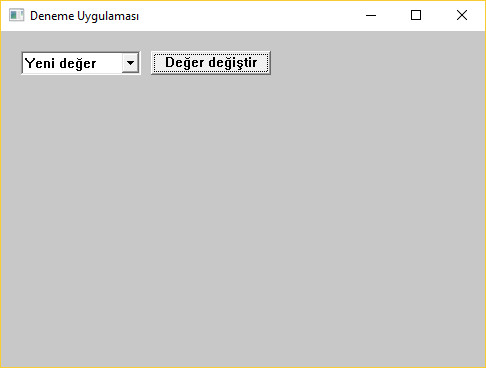 Programı derleyip çalıştırdığımızda, ComboBox kontrolünün herhangi bir elemanını seçer ve butona tıklarsak, seçtiğimiz eleman adı "Yeni değer" olarak değişir. Bu durumda, program aşağıdakine benzer bir görüntü oluşturacaktır: