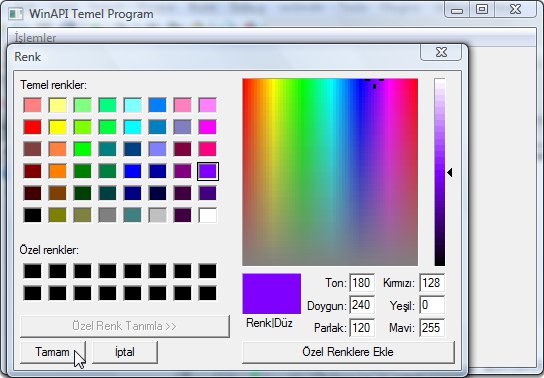 Renk seçimi: Kullanıcı sistemde tanımlı renkleri ve kendi oluşturduğu rengi seçerek, programın belirli amaçla kullanmasına olanak sağlar. Bu diyalog kutusu ile ChooseColor() fonksiyonu ve CHOOSECOLOR yapısı kullanılır.