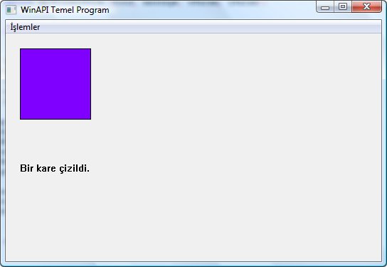 SetWindowText(hwndStatic01, "Bir kare çizildi.");