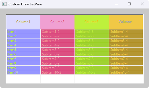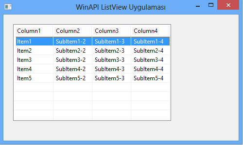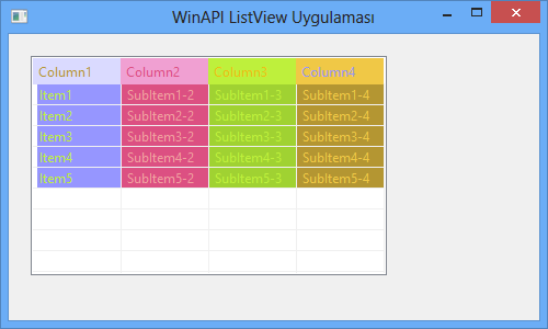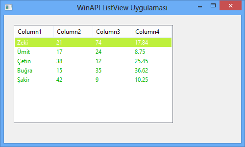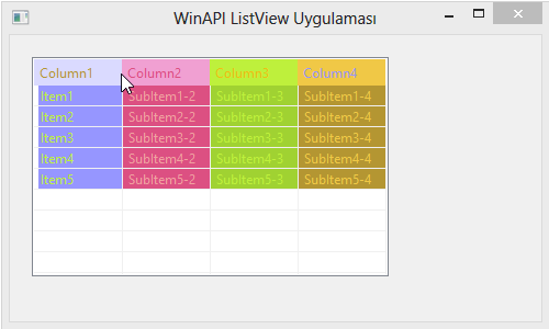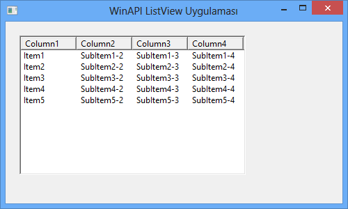Programı derleyip çalıştırdığımızda 4 sütunlu ve 10 satırlı bir ListView kontrolü oluşturulur. Bu durumda, program aşağıdakine benzer bir görüntü oluşturacaktır: