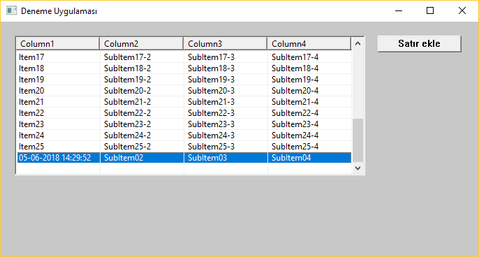 Programı derleyip çalıştırdığımızda 4 sütunlu ve 25 satırlı bir ListView kontrolü oluşturulur. Butona tıkladığımızda ListView kontrolüne bir satır eklenir ve eklenen satırın seçilerek görünmesi sağlanır. Bu durumda, program aşağıdakine benzer bir görüntü oluşturacaktır: