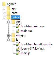 Proje ana dizini altında public adlı bir dizin ve bu dizin altında css, js ve images adlı üç adet dizin oluşturulur: