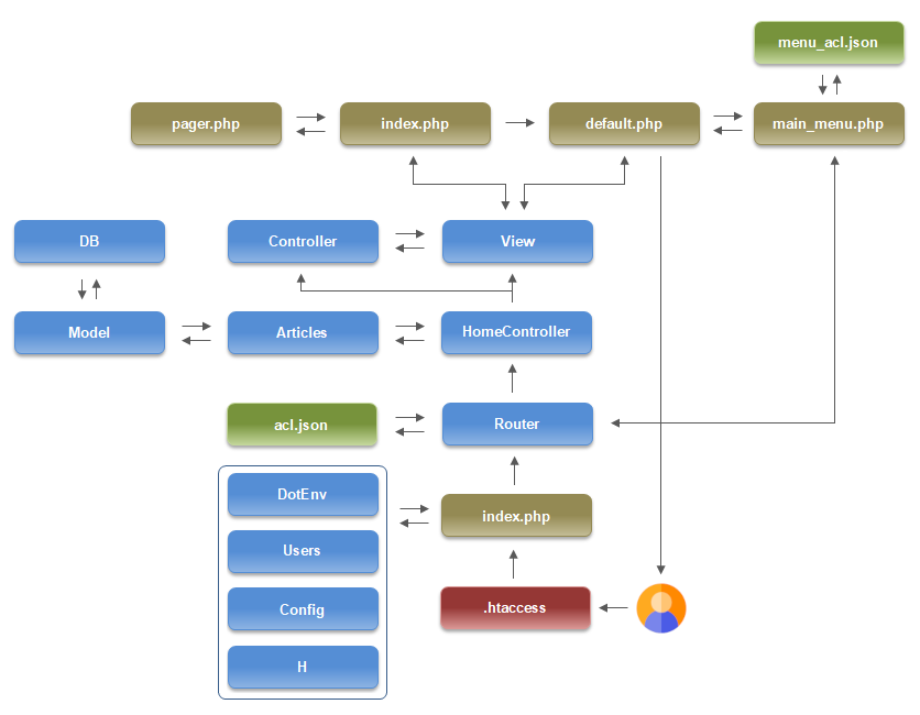 Web tarayıcı satırından hangi ifade girilirse girilsin, bu değere önce ana dizinde bulunan .htaccess dosyası işlem yapar ve akışı yine ana dizinde bulunan index.php dosyasına yönlendirir.